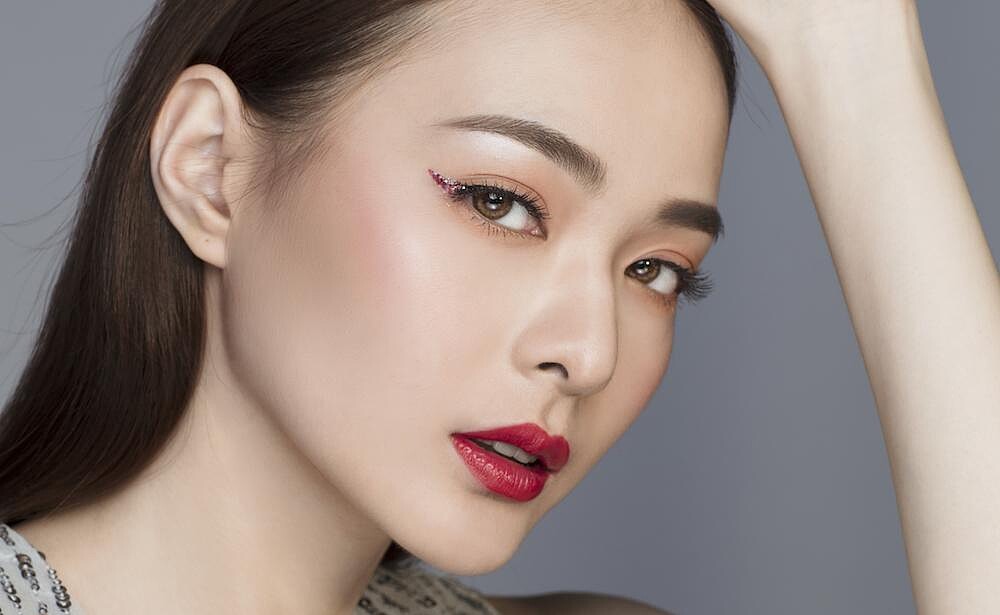 因為已經有了紅色亮片作為主角,在眼影的配色上就選擇清爽的大地色、橘膚色,避免妝容過於複雜而顯俗氣。