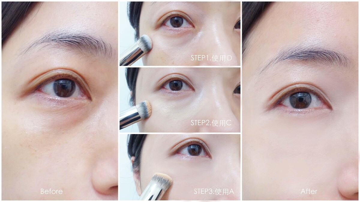STEP2:使用最接近膚色的遮瑕色C,同樣從黑眼圈下緣由內往外刷勻。
