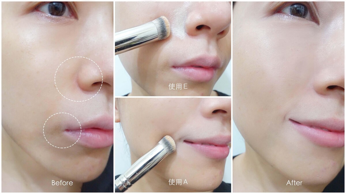 用肌膚校色黃色調E修飾泛紅,直接用刷子沾取後刷開。