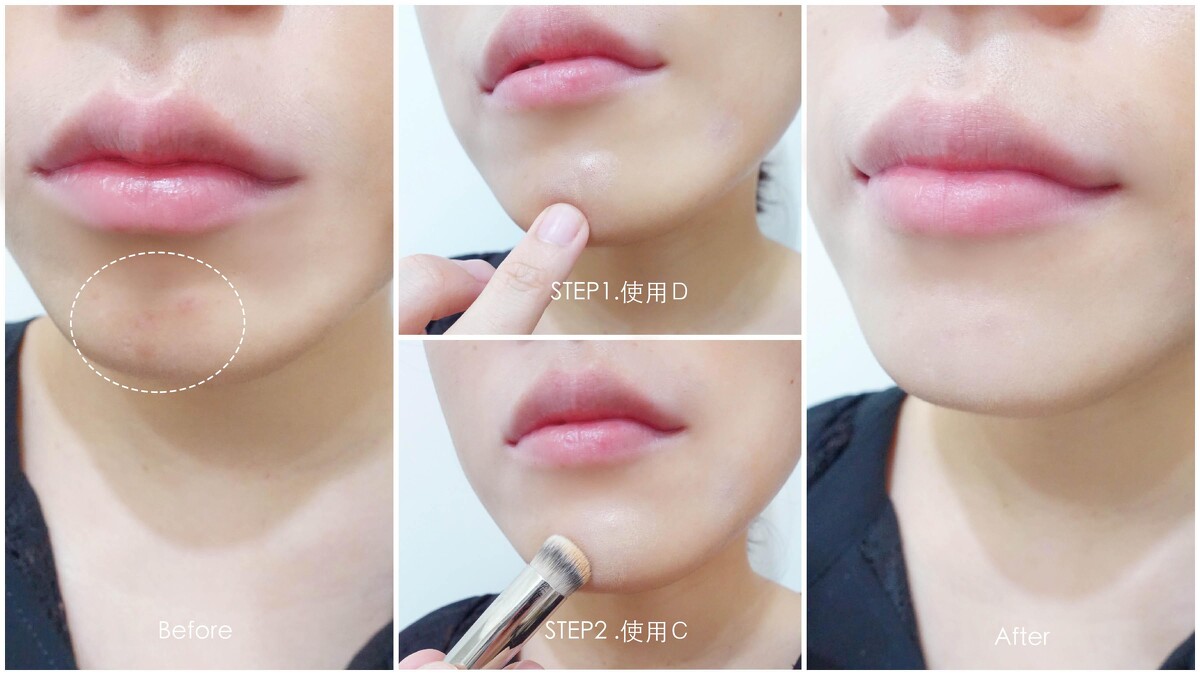 STEP2:使用刷子沾取淺色C,輕輕刷在痘痘外緣與膚色平衡色差。