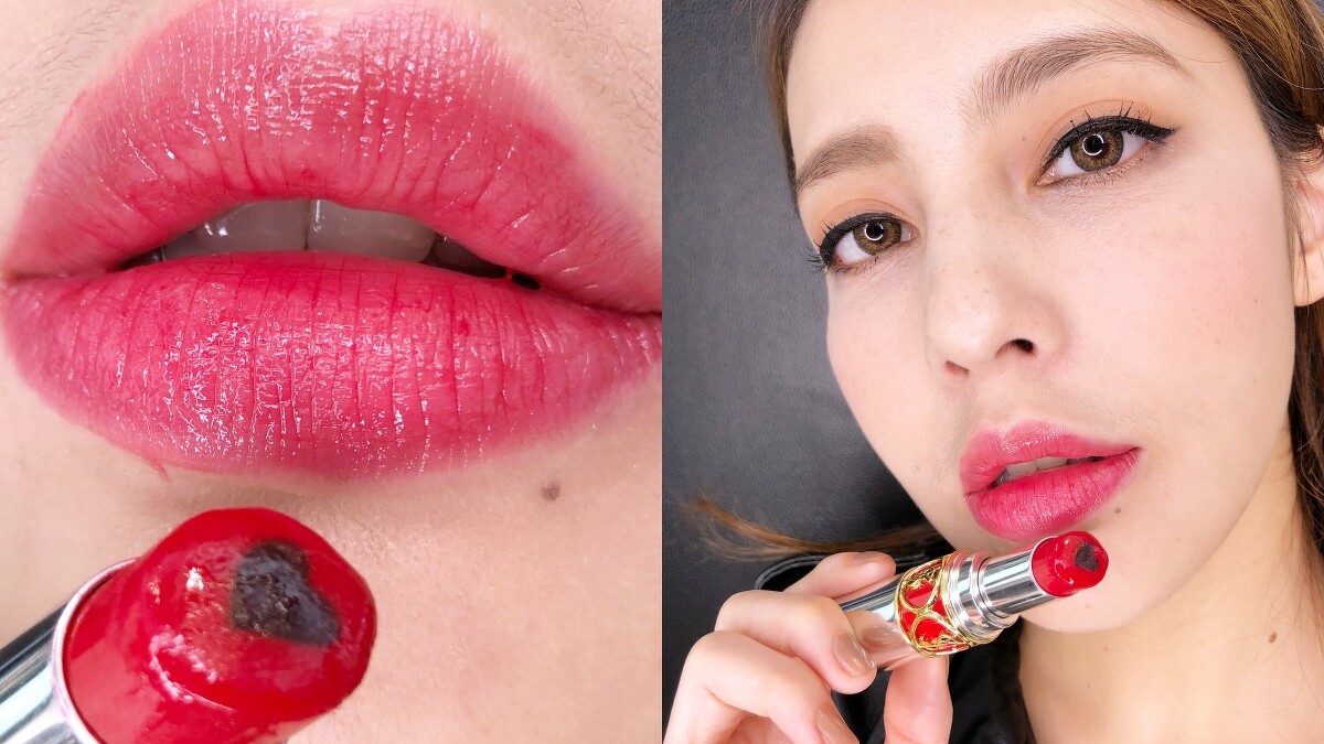 在口紅中間有顆黑色愛心的情挑誘吻豐潤蜜唇膏,同樣也是2019年推出的唇膏。結合外層 「情挑誘光水唇膏」的水潤顯色,以及內層「黑色夾心豐唇精華」的保養與增色效果,讓雙唇更豐潤。