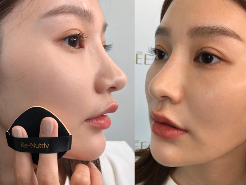 因為此次底妝定位在「粉底精華」,妝效上屬於很有保養滋潤感的寶石奶油光澤,從上圖明顯可見,左邊上妝後在膚色修飾、光澤感和遮瑕度都大大提升。