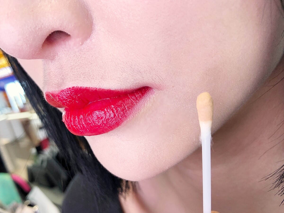 最後,再用一支棉花棒,沿著紅唇邊緣,微微將唇邊暈開,讓唇線模糊一點不那沒銳利,也是讓紅唇看起來不顯老氣的小秘訣。