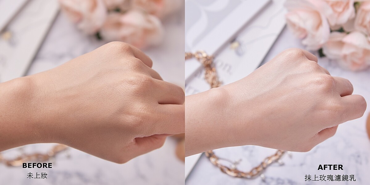 玫瑰濾鏡乳+玫瑰鮮奶茶粉底+超顯白粉餅,一抹就是零死角玫瑰濾鏡妝感,底妝不浮粉、不暗沉、不脫妝,臉蛋超無瑕,打造每個角度都完美的柔焦愛人視角。