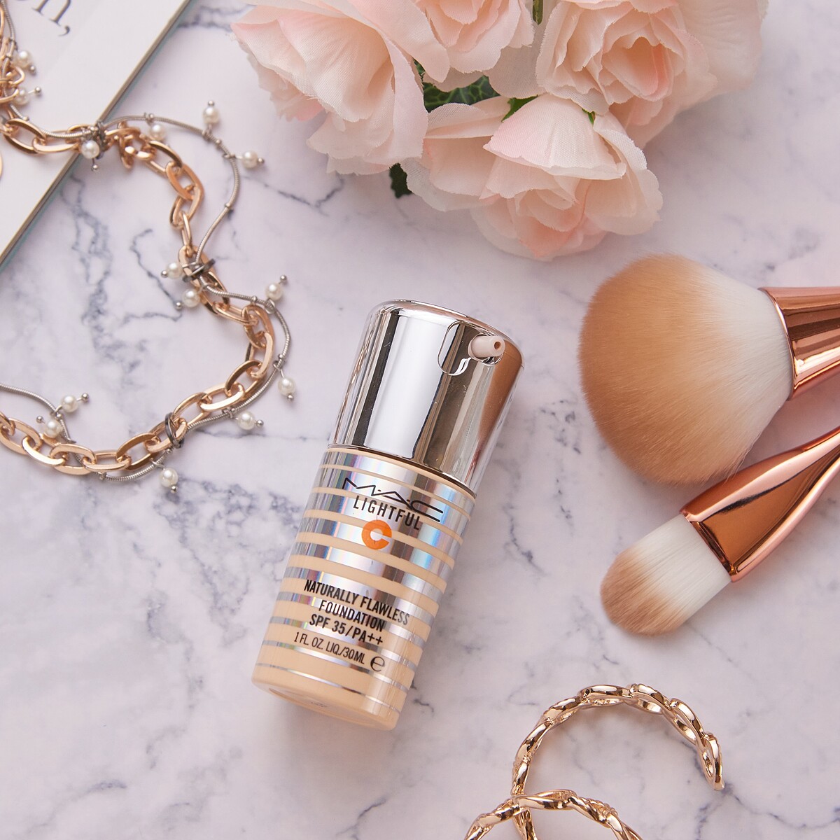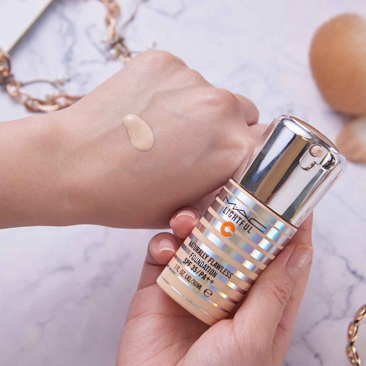 日本研發、最適合亞洲人膚色的玫瑰鮮奶茶特調-M·A·C「超顯白無瑕粉底液SPF35 PA++」,擁有高遮瑕力、薄薄一層就能完美修飾泛紅與小瑕疵,輕鬆校正泛黃疲憊的肌膚,結合抗氧化複合配方,打造一整天都粉嫩透白的好氣色。