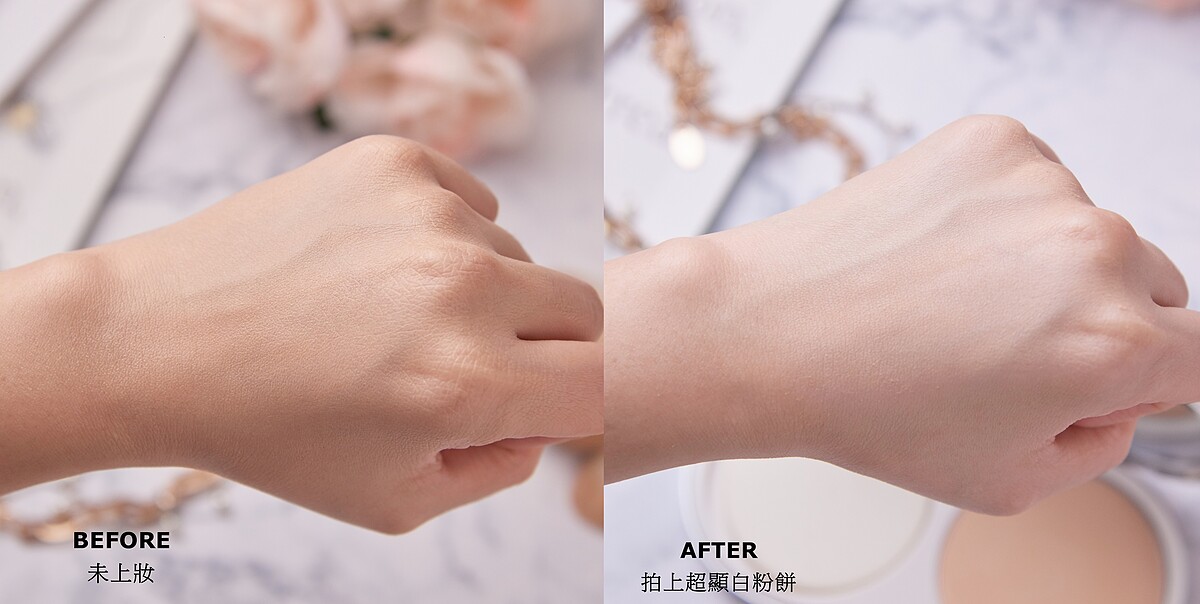 上粉餅時最怕乾澀不服貼@@不怕不怕,超顯白粉餅添加珊瑚草精萃,讓完妝肌膚極度保水不乾澀,加上超細緻的粉質,服貼度優秀到根本第二層肌膚,不僅油性膚質持妝不浮粉,乾性膚質也完全服貼不脫皮,各種膚質都適用。
