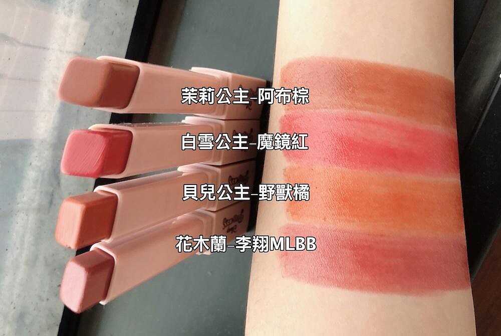 色號:花木蘭-李翔MLBB、白雪公主-魔鏡紅、貝兒公主-野獸橘、茉莉公主-阿布棕