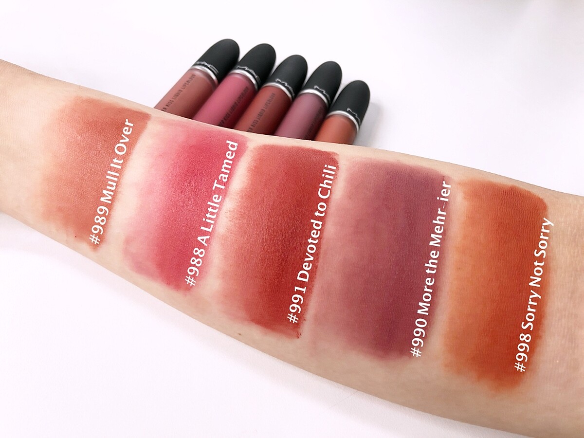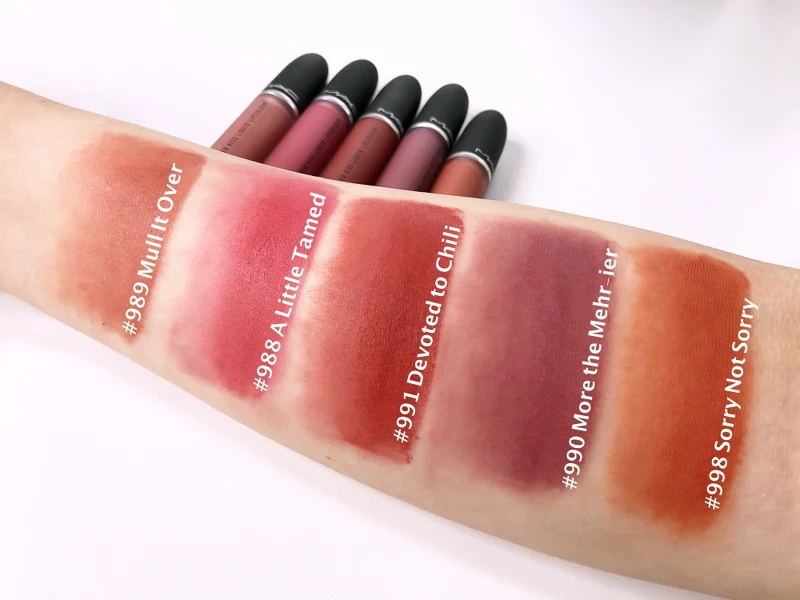 絲柔粉霧唇釉一口氣推出17色,從奶茶色調、玫瑰色調到磚紅色調通通有,當中內含6款暢銷絲柔粉霧唇膏的明星色,與11款全新色號。其中台灣主打的顏色有:#991 Devoted to Chili磚紅辣椒色、#989 Mull It Over蜜桃烏龍色、#988 A Little Tamed乾燥玫瑰色、#990 More the Mehr-ier煙燻漿果色、#998 Sorry Not Sorry奶油南瓜色。