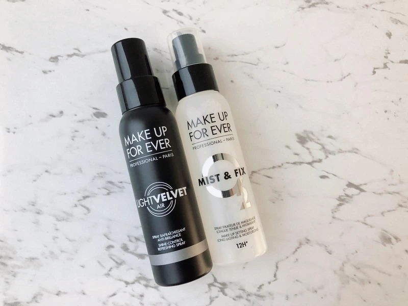 MAKE UP FOR EVER一直以來最熱賣的定妝噴霧「超光肌活氧水(透明白瓶)」,是韓國銷售第一的長賣單品。2020年又推出了全新的定妝產品「微霧輕感粉噴霧(黑特霧)」。兩者主要的不同處在:白瓶保濕更高,很適合給乾肌;黑色控油較強,適合給油肌和混合肌