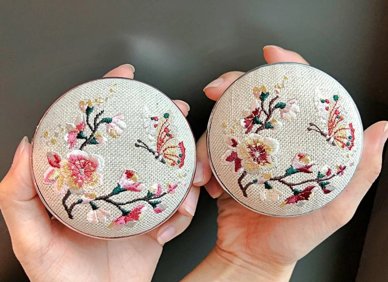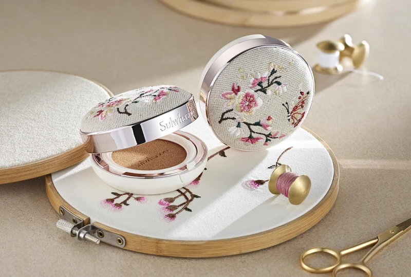此次的設計和以往大大不同,氣墊外殼首次運用法式刺繡工藝,藉由一鉤一針精緻的刺繡出立體靈活的「春梅」與「彩蝶」,精緻工藝將氣墊化作為華美的配件,展現東方元素之美。