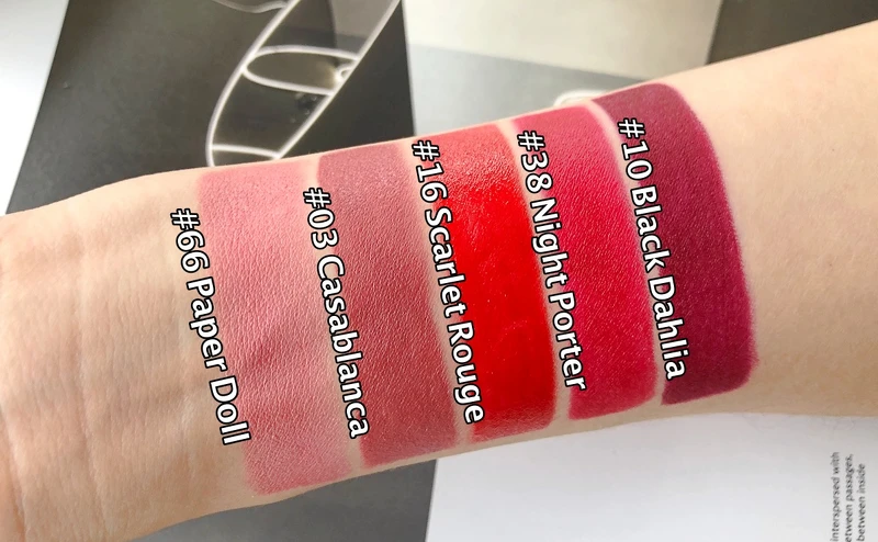 五色全試色:#66 Paper Doll(水潤)#03 Casablanca(水潤)#16 Scarlet Rouge(水潤)#38 Night Porter(微霧)#10 Black Dahlia(微霧)