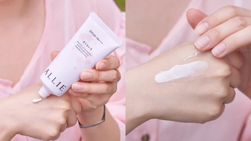 閨蜜野餐日,擦上夢幻限定的「燦爛光澤肌UV防曬水凝乳#粉肌櫻香」。