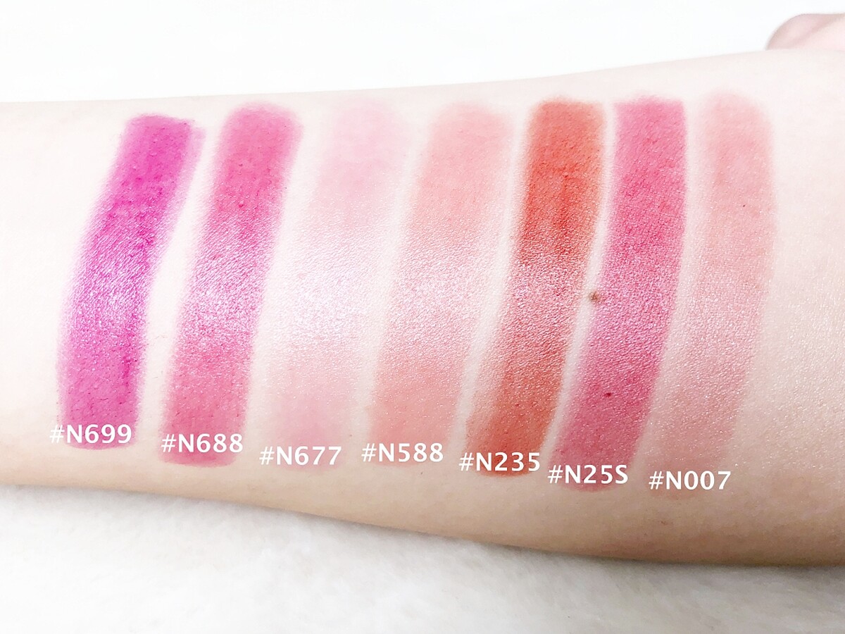 紅寶之吻高訂晶鑽唇膏當中最重要的就是加入「晶鑽粉末」可反射透亮光澤,還有玻尿酸微粒、沒藥可長效豐潤雙唇,一共推出7個顏色,包括:#N007裸荔蘭姆、#N25S血腥瑪麗、#N235濃情番茄瑪格麗特、#N588蜜桃氣泡酒、#N677莓戀沙瓦、#N688覆盆莓酒、#N699紫莓佳人。