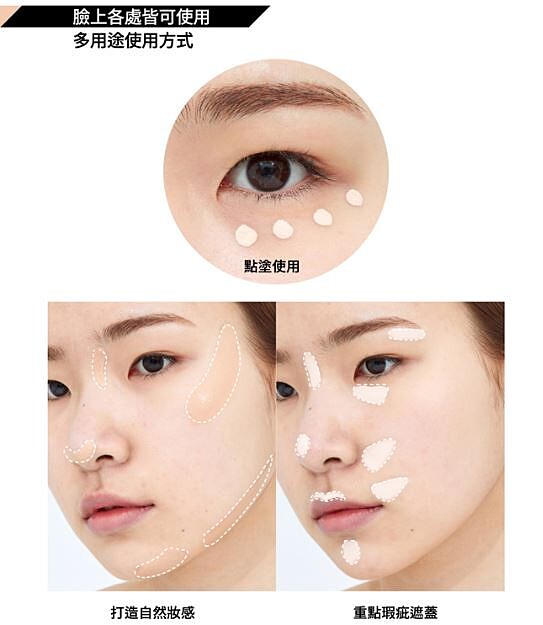 針對黑眼圈、泛紅痘痘等瑕疵,可以使用#04粉膚色,用輕點的方式均勻上色,再用美妝蛋,或無名指輕輕點狀推勻,自然又親膚。