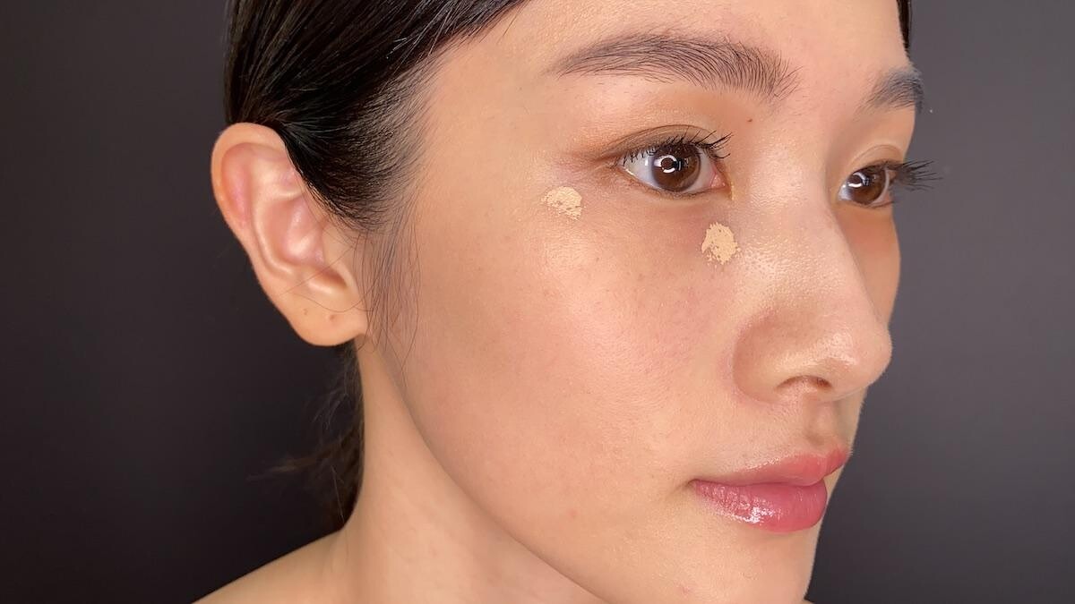 Step1: 使用與粉底液相同色選的超完美持久遮瑕乳,於眼頭與眼尾下方,輕點上少量遮瑕乳。