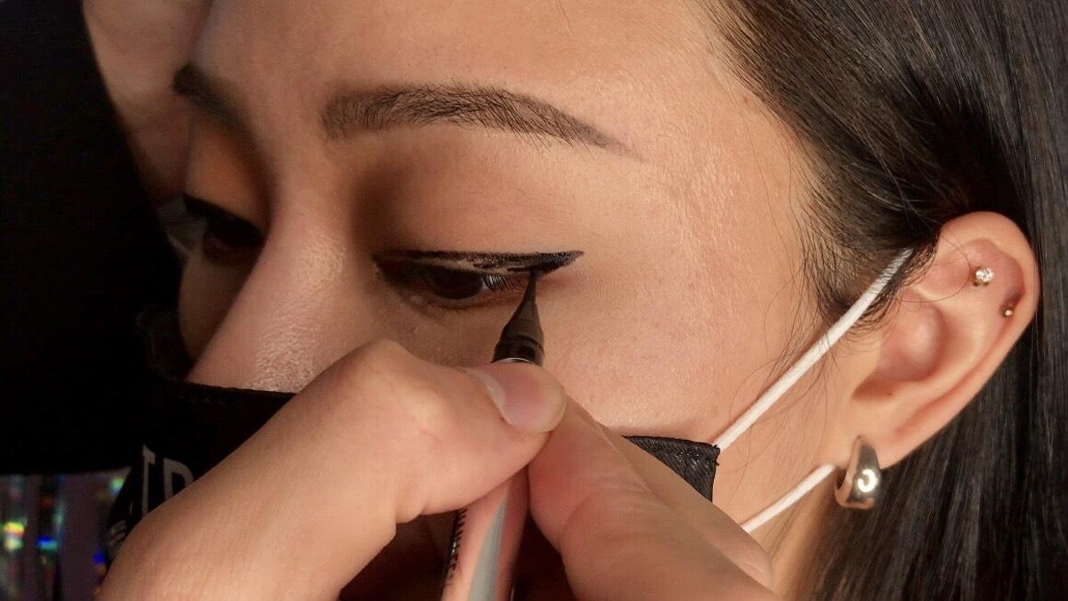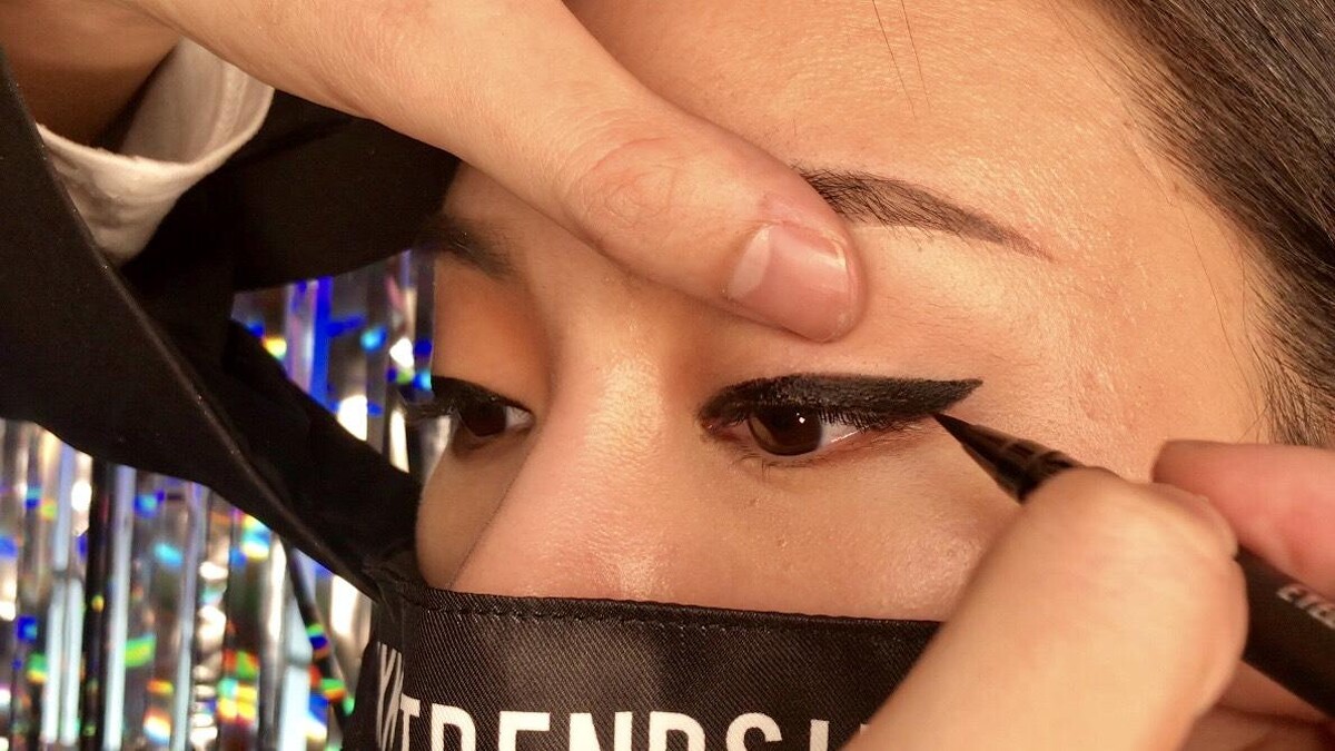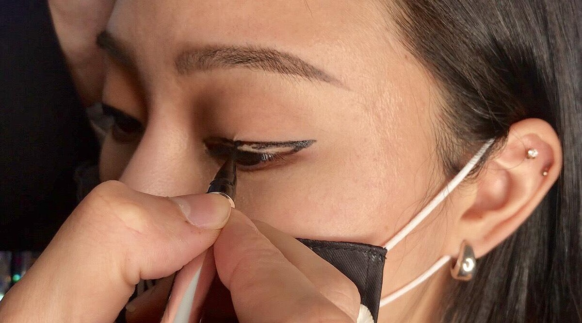 Step1:以「超速成球型眼線液筆」從眼尾往上延伸到三角帶開始塑型框邊,接著拉到眼中段,再從眼頭接回來補好輪廓,然後填型。
