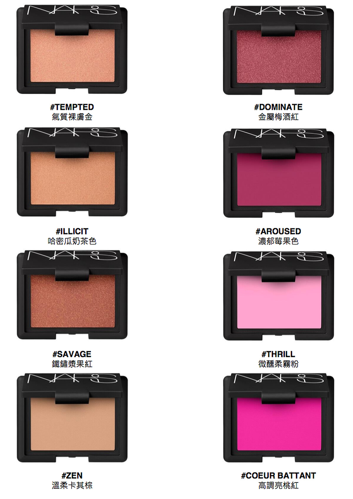 2020年NARS炫色腮紅以經典16色為基礎再推出全新10色,全色系包含霧面、柔緞及閃耀光澤等多種質地。一貫的細膩粉質,輕柔好暈染,透過層層堆疊展現豐富的絕佳色調。高度顯色的粉體,輕輕一刷就能擁有極具吸引力的頰彩。