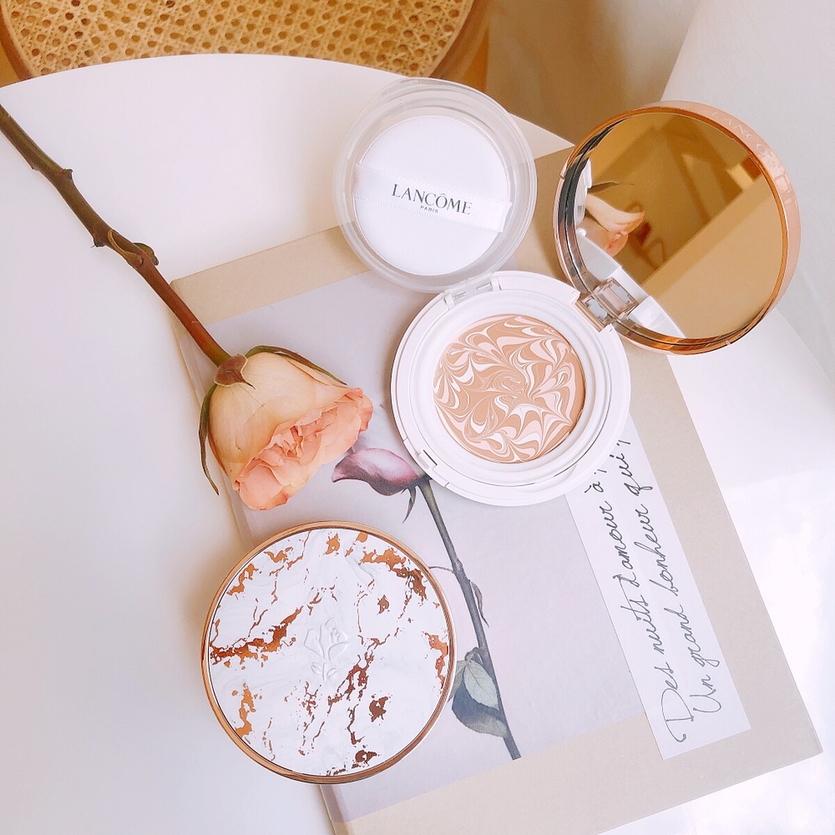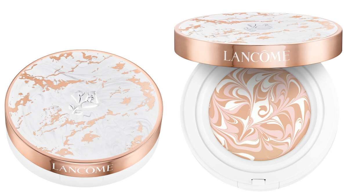 超極光精華水粉霜從外殼到內裡都極為高顏值,外殼是大理石花紋設計,搭配玫瑰金鑲嵌外圈,並烙印上白色立體的LANCÔME玫瑰。一打開盒子,出現的水粉霜也是宛如拉花般的圖案,非常精緻。
