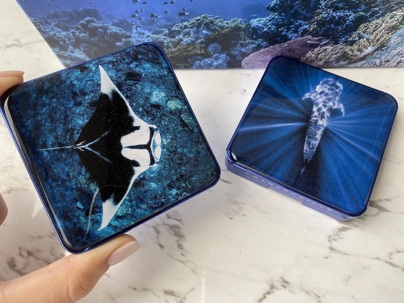 此次合作包含了花妍絢光唇彩和蔚藍海洋頰彩亮顏盤,限定彩盤盒身上更分別繪印了WildAid攝影師Shawn Heinrichs拍攝的鯨鯊及鬼蝠鱝,希望透過此次合作,喚起人類保育海洋生態的意識,慈善彩妝所得部分收益將會協助WildAid野生救援組織的鯊魚與魟魚救援計畫。