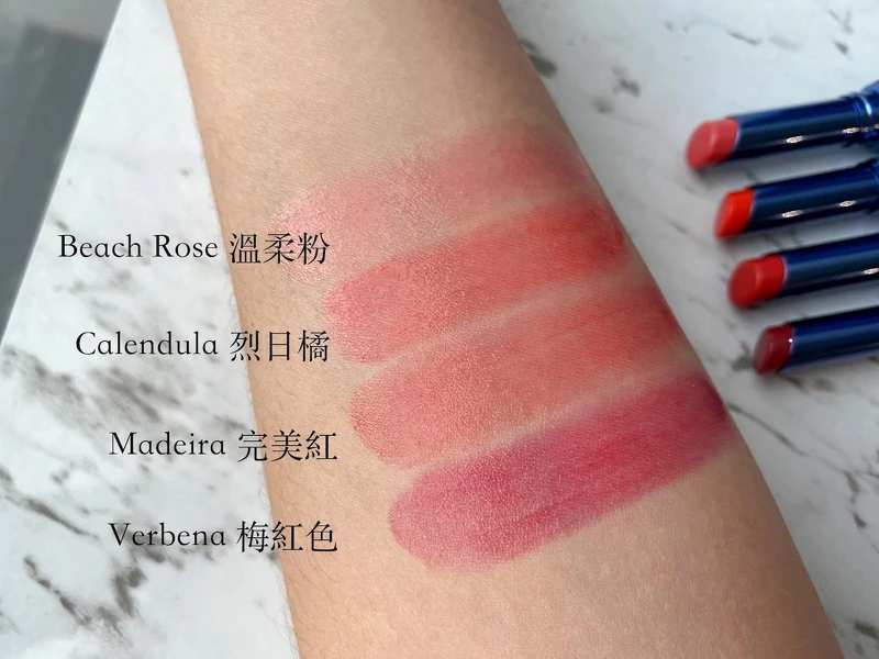 馬鞭草Verbena:梅紅色、沙灘玫瑰Beach Rose:溫柔粉、金盞花Calendula:烈日橘、馬德拉Madeira:完美紅