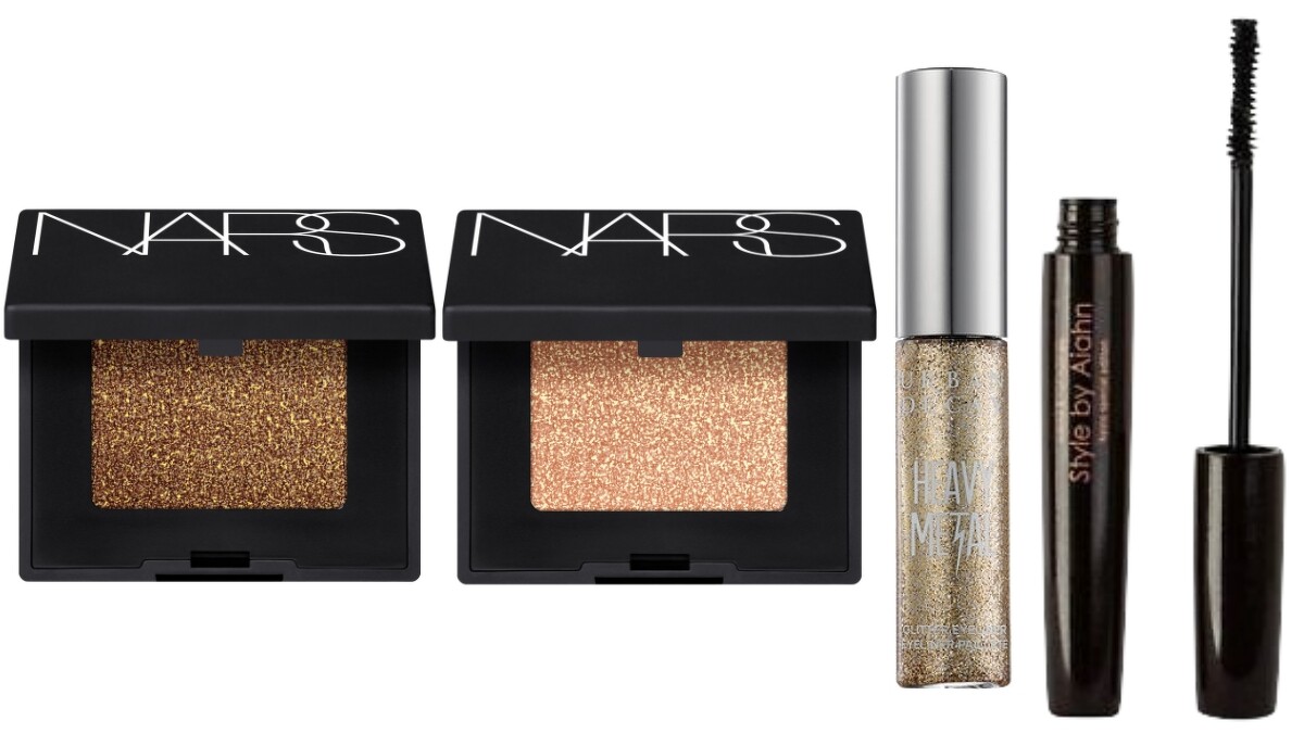 主要使用了NARS的閃耀單色眼影,包括眼皮使用#Galapasgos、暈染時則使用#Pattaya。下眼線中央畫上Urban Decay帶有亮片的眼線液(Heavy Metal Glitter Eyeliner),最後再刷上韓國品牌Style by Aiahn的睫毛膏,就完成這個自然又有神的眼妝。