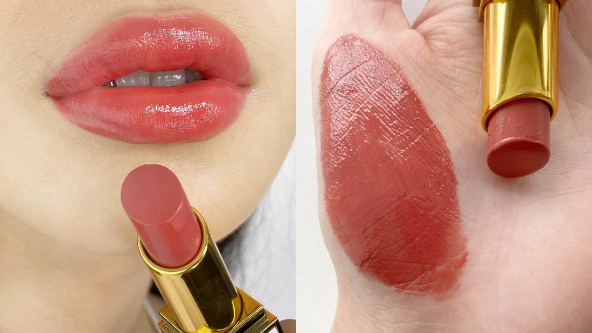 暖調紅棕栗子色,加上光澤感,擦起來唇紅齒白不顯黃皮、女人味十足。