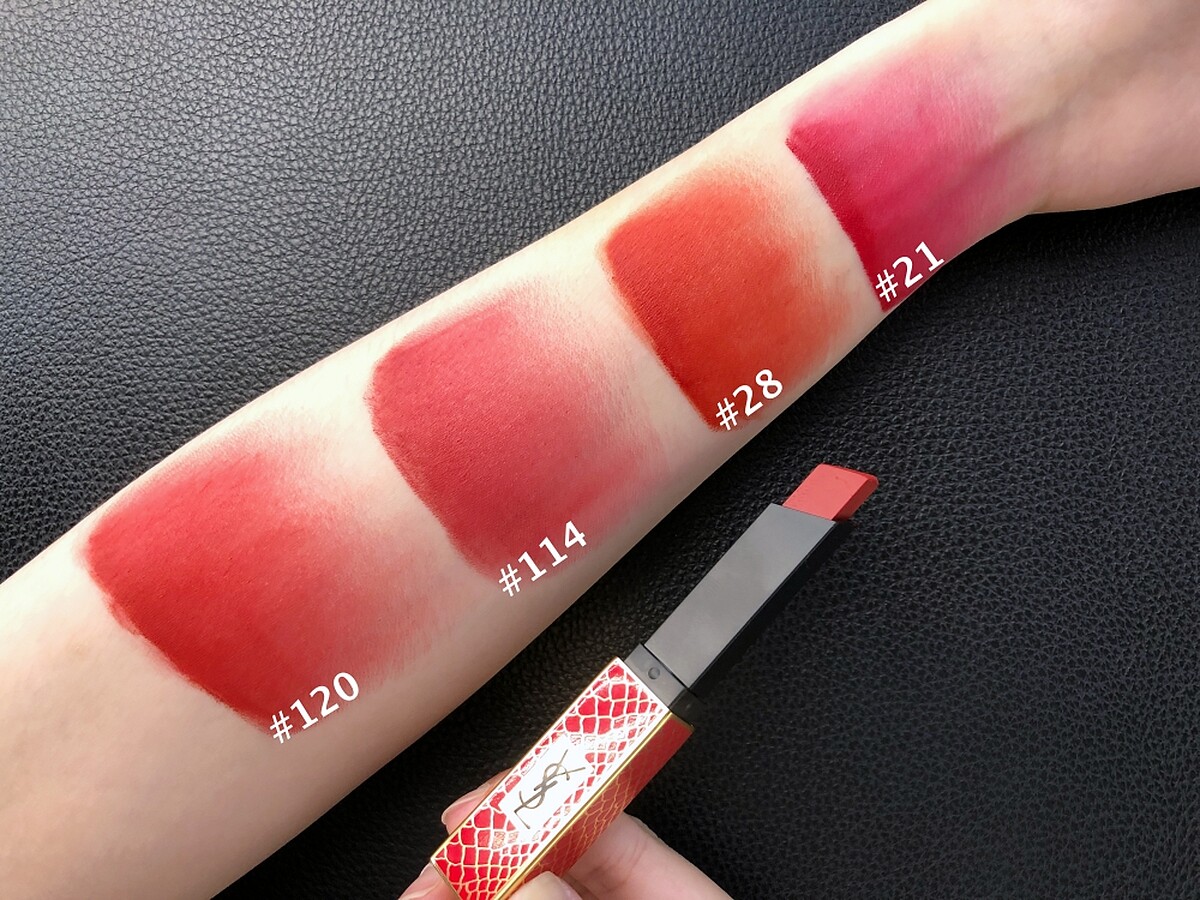 YSL 時尚印記雪絨唇釉一共推出14色,包括:#201緋紅線索、#202珊情圈套、#203玫紅陷阱、#204粉雪暗號、#205火辣吻痕、#206酒紅密碼、#208 赤紅狂熱、#209 漿果反叛、#210 醺裸任務、#211紅絨煽動、#212雪絨柿言、#213雪桃聯盟、#214蜜桃突擊、#216甜玫雪絨。