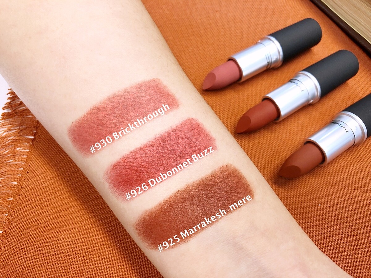 絲柔粉霧唇膏新色主打:#930 Brickthrough焦糖玫瑰、#926 Dubonnet Buzz、#925 Marrakesh-mere。