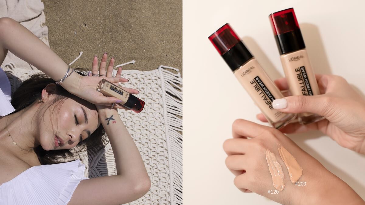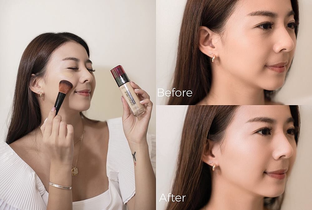 PAULINE推薦的原因除了開架粉底價格親民外,她說24H無瑕完美粉底液推開後不黏膩不沾染,粉底液用法可搭配刷具順著由內往外刷,能一秒撫平毛孔,妝感更細緻,為了實測不脫妝的效果,拍攝當天幾cut棚拍後她立刻出外景,36度高溫真的每一拍都是汗如雨下的狀態,毛孔還是牢牢被隱形,連爆汗的髮際線竟然也沒有脫妝痕,開架粉底液這麼完美一定要推啊!