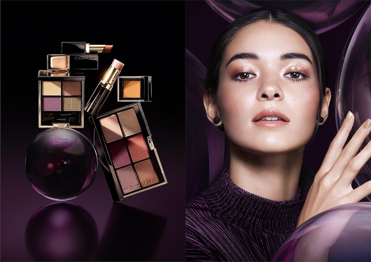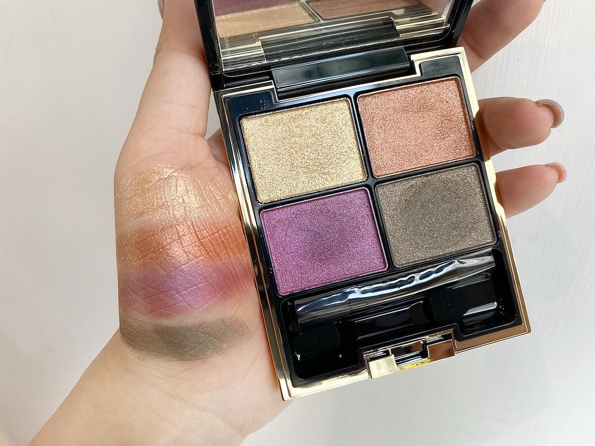 SUQQU人氣的經典4色眼彩盤,以「蜻蛉玉」般的華麗感與晶瑩透亮層次為靈感打造,耀眼亮燦的銅色搭配高透明度的水晶紫色調,再疊擦如金箔般璀璨光感的燦爛金色,打造晶瑩透亮的層次美感。