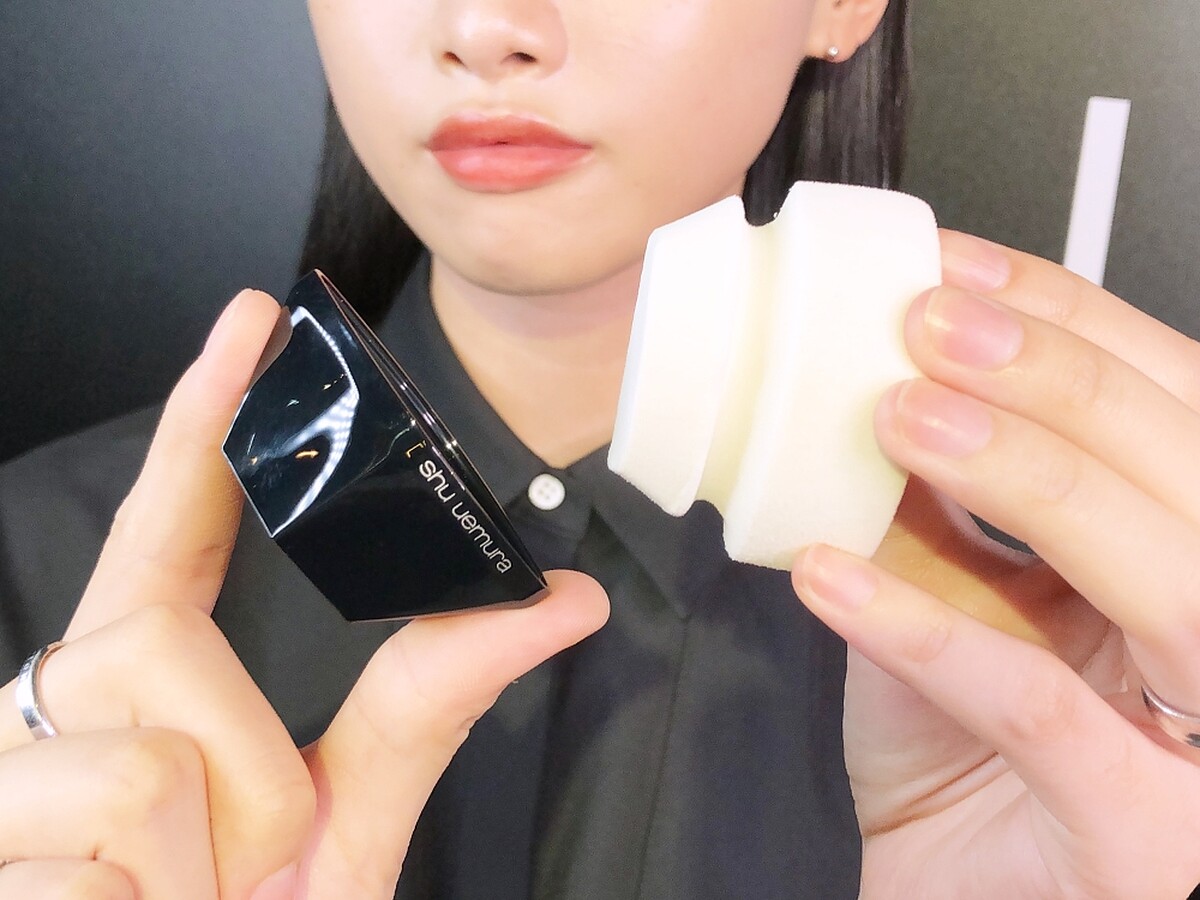 觸感蓬厚紮實、充滿彈性,使用時可以輕壓再推開,超簡單就能打造光澤滿溢的服貼底妝。針對需要加強光感的局部,如蘋果肌或鼻樑,可以再用#55海綿輕輕點拍,即可強提亮、高度遮瑕。