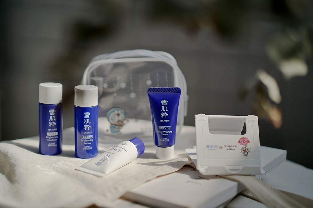 化妝包是每個女孩必備的小物之一,雪肌粹哆啦A夢透明化妝包可將保養彩妝小物收入,需要什麼一目瞭然。尤其是外出旅行,推薦放入今年8月上市的雪肌粹輕旅行保養組,內含卸妝凝膠、淨白洗面乳、化妝水與乳液,基礎保養一次搞定。