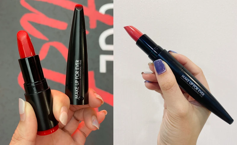 MAKE UP FOR EVER全新研發筆刷式唇膏,將唇膏蓋設計成唇刷筆桿造型,可以卡在唇膏後方變成一隻完整的唇膏筆,促使上色施力點更均勻,結合唇膏體子彈頭的造型設計,即使沒有唇刷筆,也能精準上妝,繪製完美唇色並勾勒立體唇型。