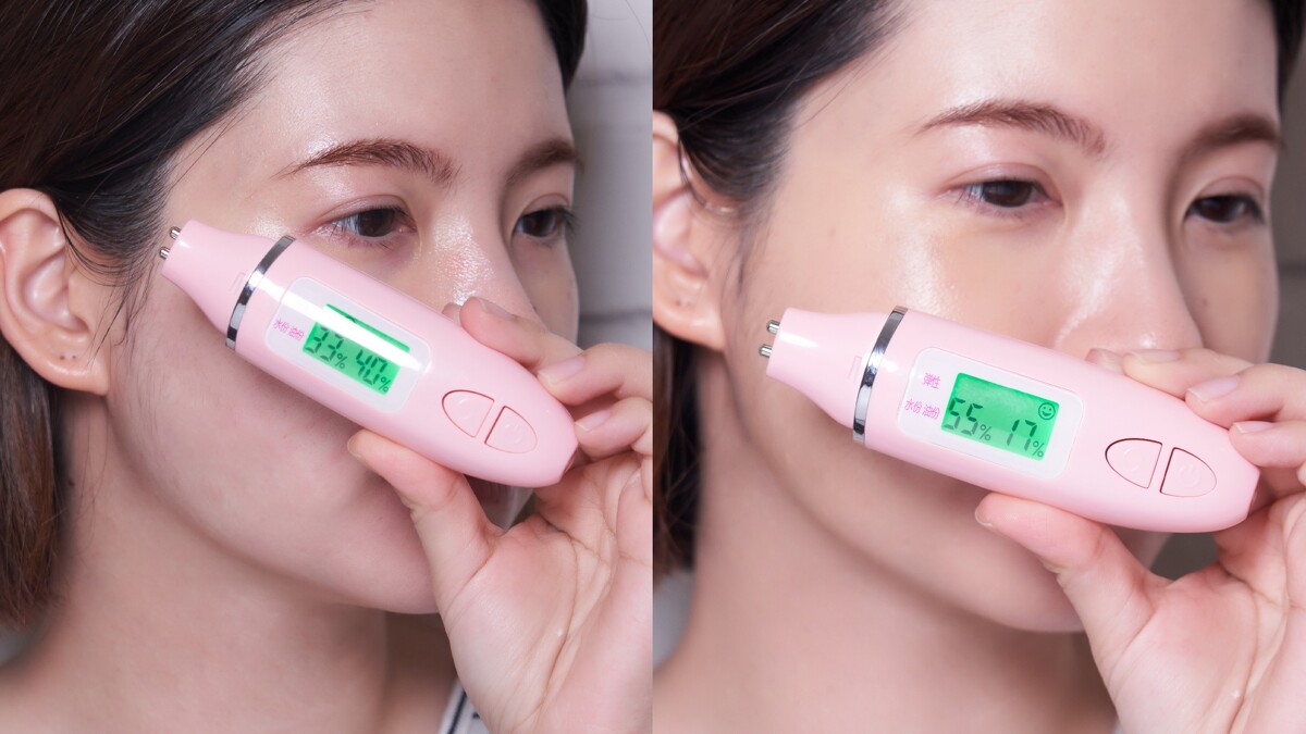 經實測後發現上妝竟比素顏還水潤!!!數值由33%飆升至55%,上升22%有夠驚人,而且連油份都從40%降低至17%,達到保濕卻不油膩的舒適上妝感,連M編是T字油兩頰乾也很可以,絕對是乾肌的夢幻逸品阿。