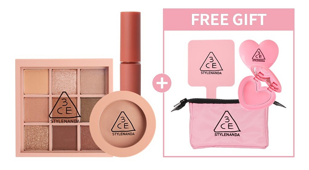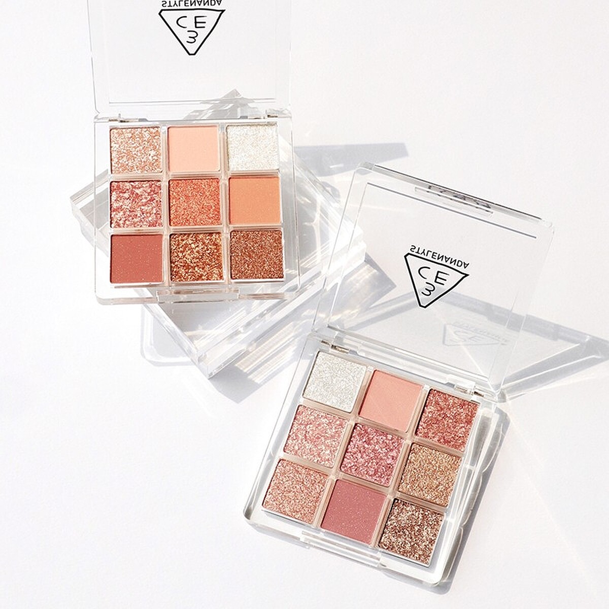 3CE的九色眼影盤因為配色實用,擁有相當高的人氣,目前的兩款配色還正好搭上裸粉奶茶、乾燥玫瑰的風潮,因此非常受歡迎。而「半糖粉鑽」、「焦糖金鑽」四色眼影盤自帶閃光,也是相當熱門的款式。