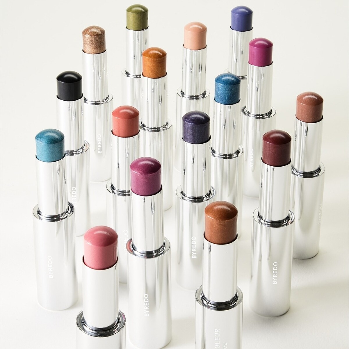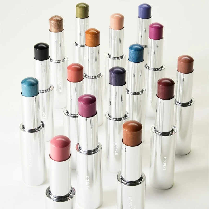 除了搶眼的曲線造型,BYREDO彩妝品項也出乎意料的多,一口氣推出六樣產品,包括:多用途彩妝棒16色、口紅15色、潤唇膏、睫毛膏、眼線液、眼影盤等等。