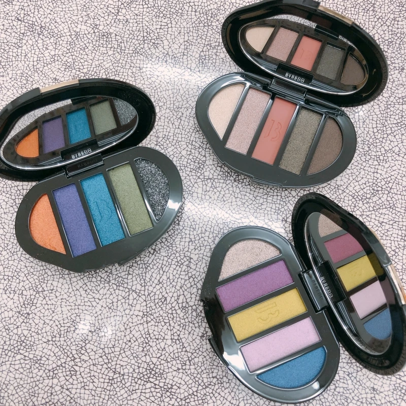 彩妝系列中較晚上市的是五色眼彩盤(預計2020年底上市)。金屬質感般的獨特外盒如波浪起伏,符合人體工學,就像是水滴在水面激起的漣漪。 五個顏色的粉狀眼影,搭配粉霧、金屬以及極致閃耀等三種妝效,而且質地輕盈,非常適合用手指上妝。