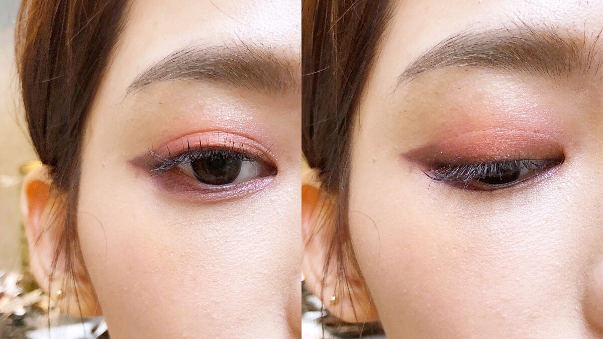晶采立體眼彩盤推出兩色(#135惹包、#136恋編),左上角以明顯的亮片珠光帶出節慶的歡樂感,右下角則搭配霧面色平衡眼妝。