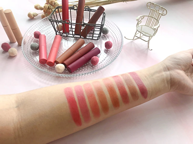 唇釉的包裝是方形的色塊,目前共有6色,妝感是比較偏光澤型的,官方主打薄擦、後塗可以展現不同的妝效,顯色度是可以堆疊的類型,其中6號色是一個非常秋冬的肉桂棕色,讓人超想試試看的啊!