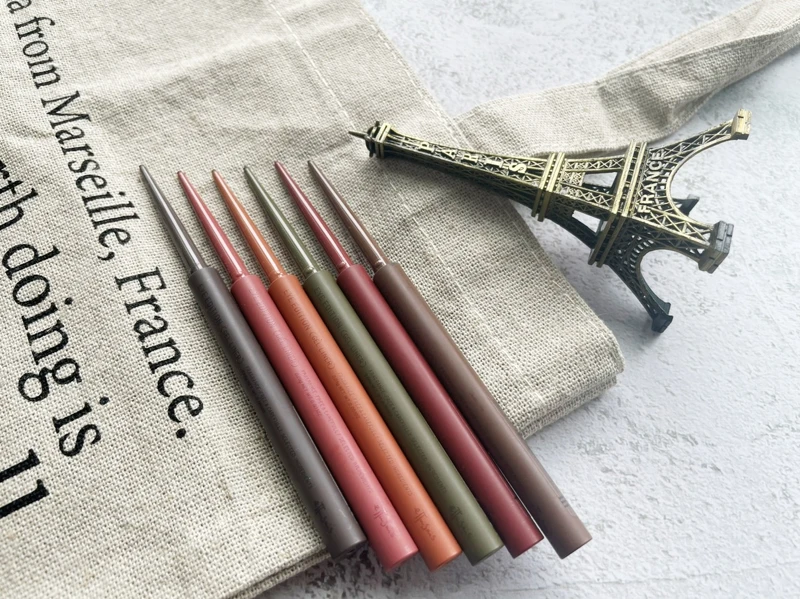 眼線膠筆同樣也是六色,全霧面的色票包裝十分療癒,添加了角鲨烷、荷荷芭油等保濕成分,畫起來更滑順好延展,色彩豐富除了可當眼線使用外,也可在睫毛根部暈染加強眼神深邃度。