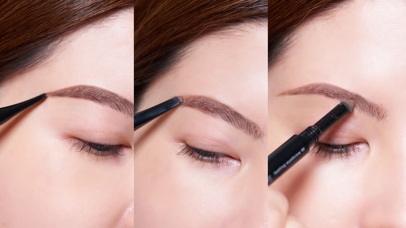 先從眉尾開始,使用銳角勾勒出纖細線條&微上揚的角度、再用寬面輕鬆繪飾大面積眉型,看起來更加自然、並降低銳利感。