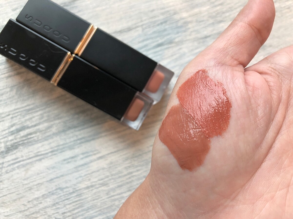 晶采柔艷唇釉霧光#08春摘,紅棕感的茶色,非常顯白。晶采柔艷唇釉潤光#08艷亞麻,擦起來很溫柔的摩卡棕色。