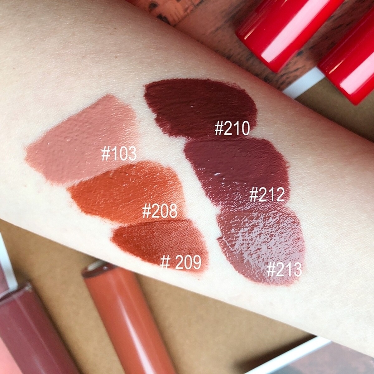 奢華絲絨訂製唇萃威尼斯日落暖棕系列共推出10色,其中有全新六色為:#103晨曦裸粉、#208薄暮暖橘、#209暖暮紅棕、#210午夜可可、#212晚霞勃根地、#213日落玫瑰。