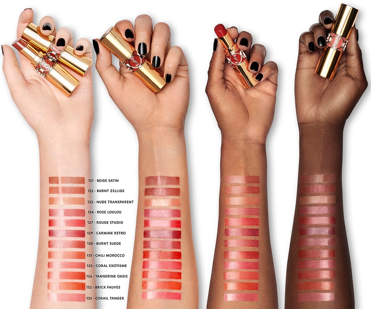 同時並透過純萃調色科技及粉嫩顯白粒子提高色彩明度,跳脫以往漿果紅、莓果色系唇膏給人難以駕馭的形象,將YSL先生最愛的摩洛哥馬拉喀什城的多變白晝、夕陽、深夜情調,化為極致時髦且能平衡蠟黃肌膚的裸紅棕色系,帶著一點微醺甜美感,擦出滿滿勾人氣息。