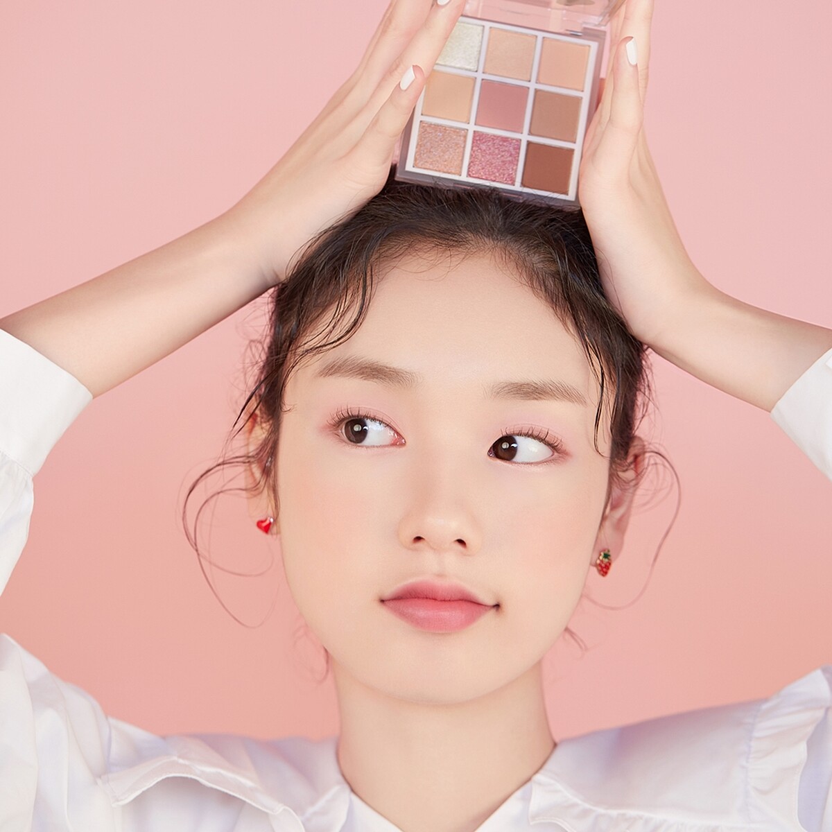 草莓奶霜妝容重點就是粉嫩色系,但粉色眼影一不小心容易讓眼睛看起來腫腫泡泡的,這是可以先選擇「霧面粉色眼影」打底、再疊上大地色系,之後以深棕色眼影在眼尾畫上ㄑ字加深眼部輪廓。最後用微量的珠光粉色打亮臥蠶,就能既不怕泡泡眼、又能增添妝容甜美氛圍。