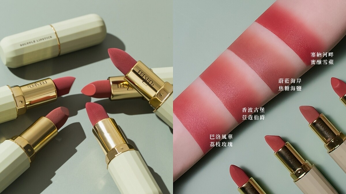 來自台灣的彩妝品牌FreshO2,先前推出了舒芙蕾絲絨唇膏受到消費者好評,2021根據春妝趨勢全新再升級,推出四色「舒芙蕾奶油絲絨唇膏」,調整了膏體中保濕成份的比例,加入微霧光妝感,讓質地更滑順、綿密,妝感也更細膩。四款色選分別為蔚藍海岸-焦糖海鹽:低調內斂的溫柔奶茶色;香波古堡-荳蔻伯爵:鄰家豆沙裸色拌入伯爵茶調和;塞納河畔-蜜釀雪蘋:成熟知性的大紅色調;巴洛風華-荔枝玫瑰:浪漫的玫瑰色調。