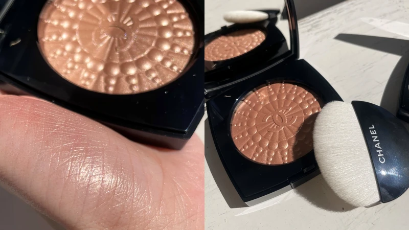 這款打亮盤為本次限定彩妝的重點之一,粉體表面刻印珍珠圖騰浮雕,以珍珠光圈圍繞著雙 C 標誌,也是致敬品牌的經典鈕扣。稍微偏粉霜狀的質地非常扎實,搭配了細緻的香檳玫瑰光澤,輕刷全臉即可綻放如同戴上珍珠項鍊,讓臉部容光煥發。