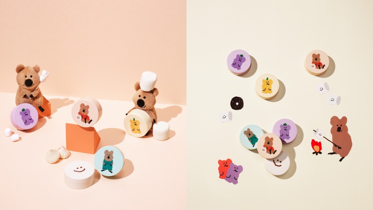三大角色分別為世界上最幸福的動物短尾袋鼠的Quokka、以小熊軟糖為創作靈感的Bobo、以及象徵溫和柔軟棉花糖的Marsh,並且也同時將Marsh溫暖的笑臉印製在粉撲上,希望能藉由可愛的圖案帶給大家幸福的感覺。
