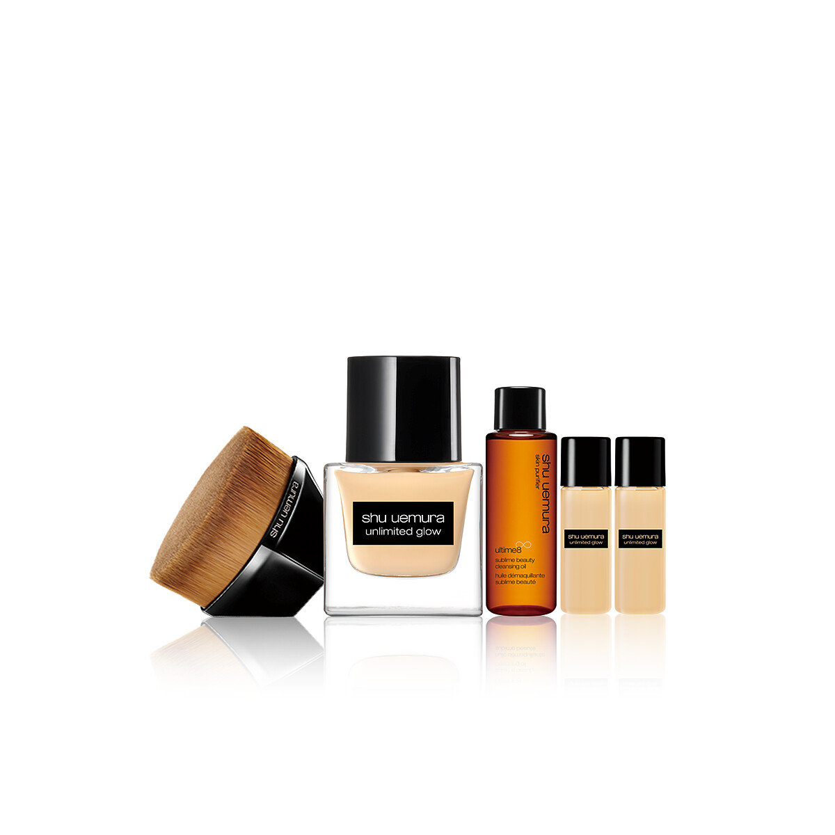 內容:無極限光澤水粉底(正貨自選色)+55零刷痕粉底刷(正貨)+全能奇蹟金萃潔顏油 15ml+無極限光澤水粉底 5mlx2