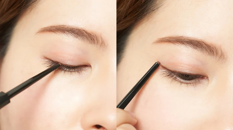 先用杏仁型筆芯的「面」在眼頭與眼際畫出細緻的線條,柔軟好上色的筆芯還能順便填補睫毛空隙。杏仁型筆芯的「角」面,在眼尾一筆勾勒出完美俐落的上挑眼線,漂亮細緻眼粧一筆到位、不失手。